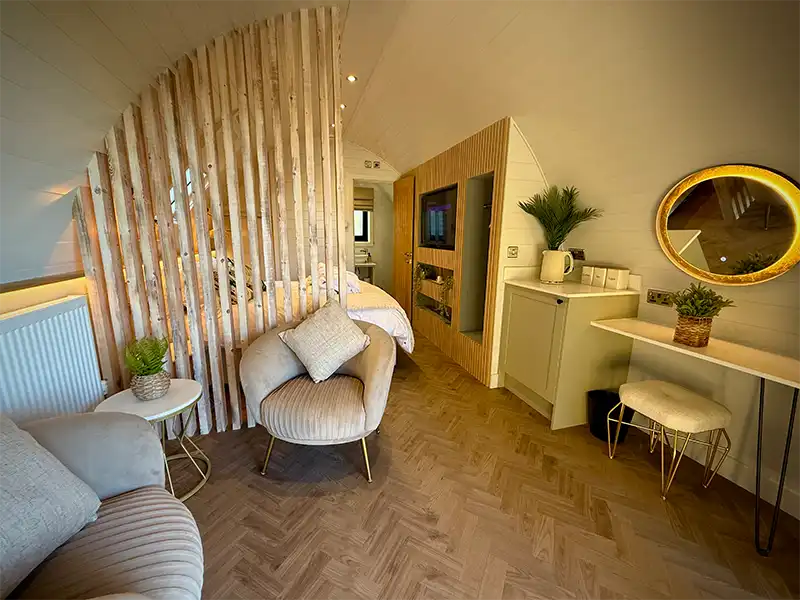 Inside, Skeeter Rock features modern interiors with warm tones, soft furnishings and thoughtful details throughout. A stylish sleeping area, en-suite bathroom, heating, fast Wi-Fi and a beautifully finished living space provide everything needed for a premium stay in complete comfort.